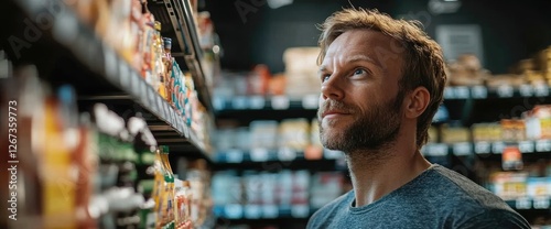 grocery, supermarket, man, shopping, food, aisle, consumer, choice, selection, product, store, market, retail, client, shopping cart, healthy, lifestyle, diet, nourishment, organic, fresh, produce, buying, purchase, good, shelf, display, consumerism, grocery, delicatessen, retail store, food market, food market