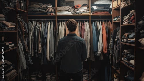 closet, man, clothes, choosing, clothes rack, clothing, room, home, outfit, selection, fashion, style, apparel, dress, shirt, jean, pant, jacket, sweater, shoe, accessory, design, textile, wear, look, collection, storage, order, organisation, space, interior, lifestyle, person, young, adult, male, back, view, decision, choice, dilemma, messy, organised, full, abundant