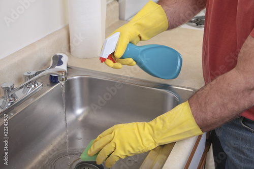 bottle, chore, clean, glove, kitchen, male, sink, squirt, adult, caucasian, chore, cleaning, cleanup, counter, damp, disinfect, disinfectant, domestic, drain, faucet, man, rinse, sponge, water, wipe