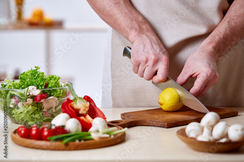 Man cooking at kitchen making healthy vegetable salad, close-up, selective focus.