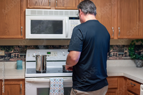 kitchen, man, apartment, cooking, lifestyle, condo, home, interior, burner, closeup, concept, adult, boiling, cooktop, copy space, daylight, electric, hot, oven, person, pot, range, stainless, steam, steaming, stove, surface, ventilated, warm, mature
