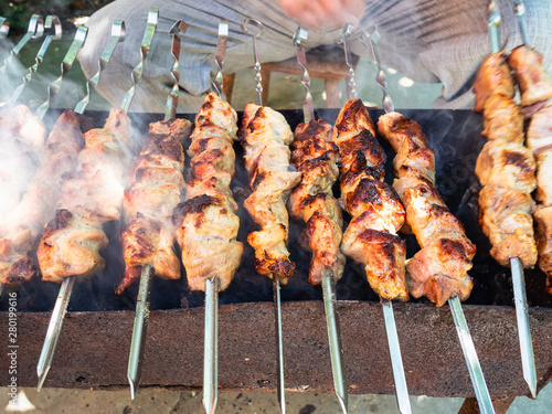 pork meat, bar-b-q, kebob, shashlik, meat, piece, skewer, metal, local, kitchen, food, cookery, cook, cooking, preparing, prepare, lot, meal, russia, russian, caucasian, roaster, brazier, outdoors, grill, roast, heater, hot, coal, smoke, many, several, man, dish