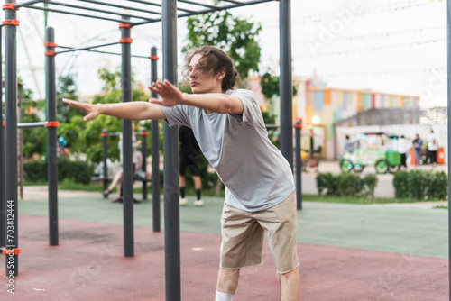 man doing sport workout outdoors, stretching his body before practice