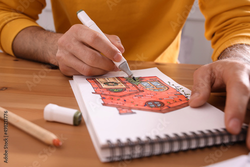 Man drawing in sketchbook with felt tip pen at wooden table, closeup