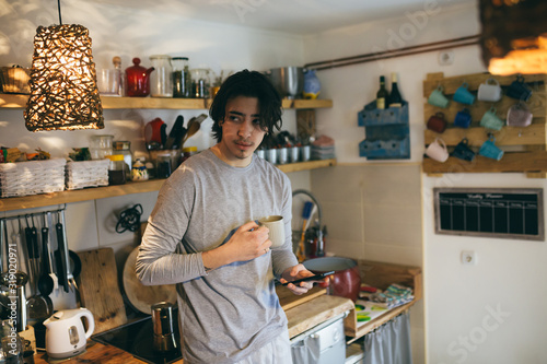 mobile phone, mobile phone, morning, hot drink, man, teenage, student, home, kitchen, 1, drinking, beverage, hot, scandinavian, caucasian, lifestyle, young, casual attire, cup of coffee, hot drink, house, relaxed, adult, modern, cup, aroma, aromatic, cappuccino, enjoy, enjoyment, mug, relax, long hair, indoor, standing, smiling, alone, mobile phone, message, using, online, talking, looking away