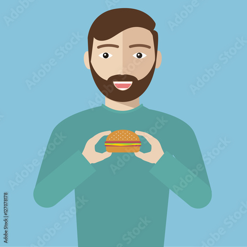 adult, beard, bite, burger, cartoon, character, cheeseburger, cookery, delicious, design, dinner, dining, dinner, dough, eat, fast, fat, flat, food, epicure, guy, hamburger, harmful, hipster, holding, human, illustration, isolated, junk, layout, lunch, male, man, meal, meat, mouth, nourishment, person, sandwich, satisfaction, snack, speed, unhealthy, vector, vertical, white