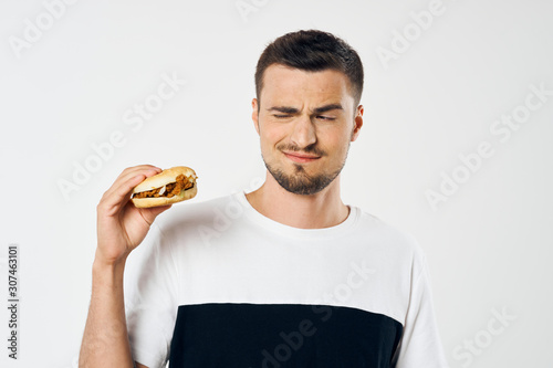 burger, man, hamburger, food, people, eating, sandwich, isolated, holding, background, studio, fat, person, healthy, eat, happy, bread, white, young, cheese, mouth, biting, serious, fries, hand, adult, fruit, drink, fork, knife, beer, cheeseburger, epicure, table, ravenous, man, portrait, tasty, shot, face, boy, looking, blue, lifestyle, year, diet, smile, shirt, tomatoes, human