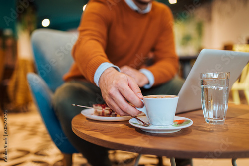 Man enjoying coffee and slice of cake in the cafe.