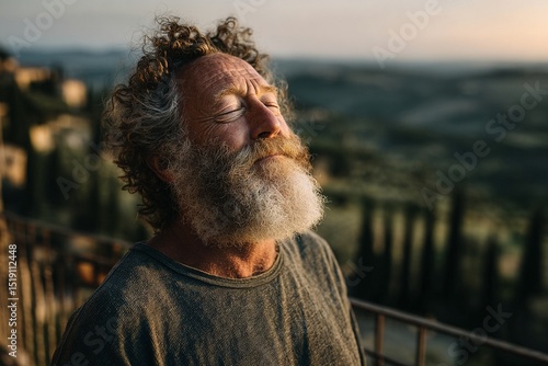 man, sunset, tuscany, countryside, nature, calmness, peaceful, sky, landscape, hill, outdoors, relaxation, bearded, elderly, contemplation, warmth, horizon, evening, serenity, picturesque, beauty, sunlight, rural, lifestyle, solitude, joy, scenic, travel, heritage, italy, adventure, meditation, natural, environment, scenic view, pastoral, grass, tradition, moment, rustic, bliss, twilight, wellness, mindfulness, exploration, emotion, generative