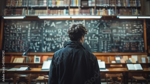 Man facing a blackboard filled with complex equations, moody library backdrop, back view, ambient lighting