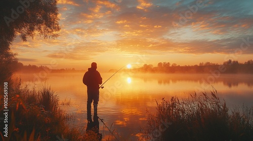 man fishing at dawn with a rod in hand, enjoying a peaceful vacation hobby surrounded by calm water and nature, a perfect outdoor activity for relaxation and scenic sunrise views