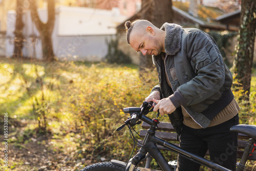 man, checking, bicycle, handlebar, fixing, adjusting, park, bike, check, inspecting, repair, tool, outdoors, bicyclist, nature, break, 1, casual attire, middle-aged, male, mature, adult, person, cycling, mechanical, problem, active, lifestyle, relaxation, environment, horizontal, copy space, people, cycle, leisure, biking, bicyclist, riding, activity, ride, sport