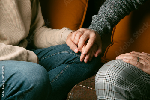 man, man, person, people, friends, gay, partner, lover, couple, 2, love, affection, emotion, hold, holding, hand, calm, console, consolation, comfort, comforting, support, supporting, assist, compassion, tenderness, warmth, human relationships, friendship, brotherhood, homosexual, homosexuality, married, husband, sitting, brown, sofa, couch, home, house, living, room, lounge, casual attire, indoor