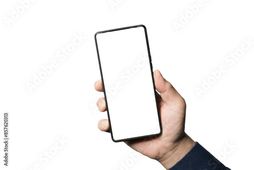 Man hand holding phone on white background with copy space. Woman holding smartphone with white screen.