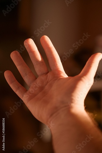 Man hand in sunlight. Isolated arm photo with nice sun rays and soft shadows.