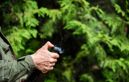 man hands open bottle of champagne alcohol and wine drink outdoo