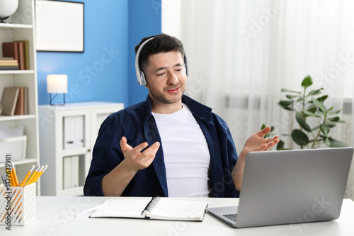 adult, apartment, background, business, caucasian, communication, computer, course, desk, device, e-learning, education, freelance, happy, having, earphones, home, indoor, cyberspace, laptop, learning, lesson, lifestyle, male, man, notebook, note, office, online, pen, person, remote, school, self, smiling, student, study, studying, table, teacher, tech, technology, using, video, virtual, web, white