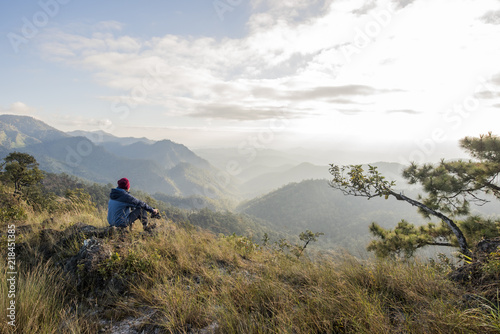 Man hiker sitting on a rock enjoying valley view from top of a mountain