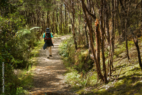 Man hiking Heaphy Track in the bush. South Island. New Zealand.