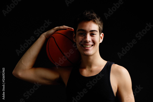 asia, basketball, black, black hair, cheerful, confidence, happy, holding, horizontal, indoor, man, one person, portrait, shoulder, smiling, sport, standing, studio shot, tank top, toothy smile, young adult, photo