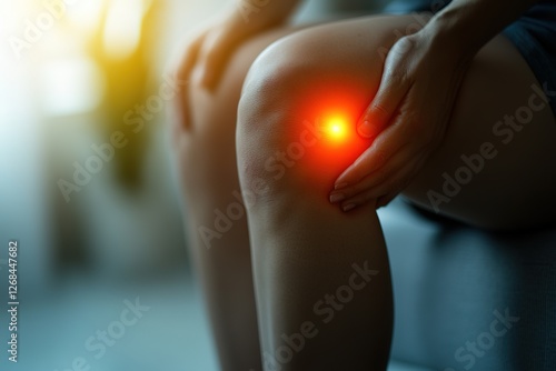 Man holding his knee in pain, close-up with a red highlight focusing on the area around and below his left knee, home background in daylight