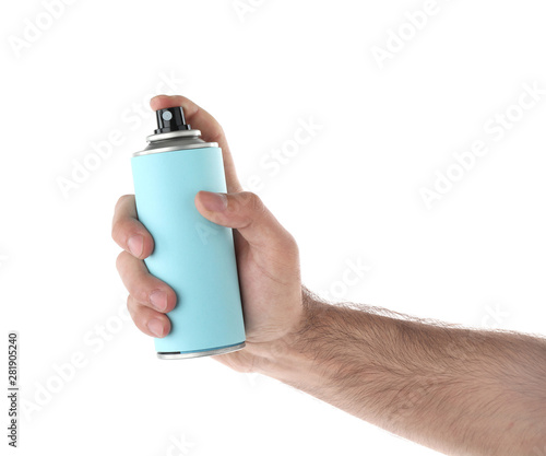 Man holding spray deodorant on white background, closeup
