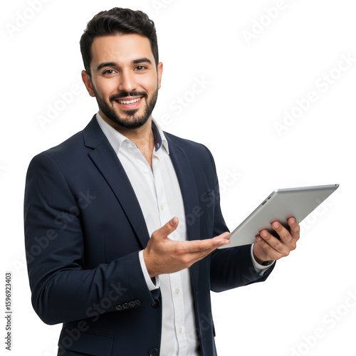 man, tablet, business, technology, professional, person, male, holding, device, computer, young, adult, caucasian, suit, smart, happy, smiling, gesture, presentation, communication, digital, information, datum, network, connection, mobile, screen, hand, portrait, studio, isolated, white, shirt, dark, blue, jacket, beard, hair, face, look, confident, success, career, transparent, background
