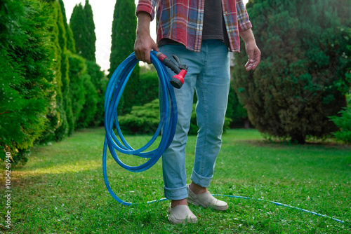 adult, background, backyard, care, closeup, day, domestic, equipment, fresh, garden, gardener, gardening, grass, green, hand, holding, hose, house, household, housekeeping, housework, inventory, irrigation, jet, landscaping, lawn, male, man, nature, nozzle, outdoors, person, plastic, pour, pressure, refreshing, season, spray, sprayed, spring, sprinkler, summer, supply, water, watering