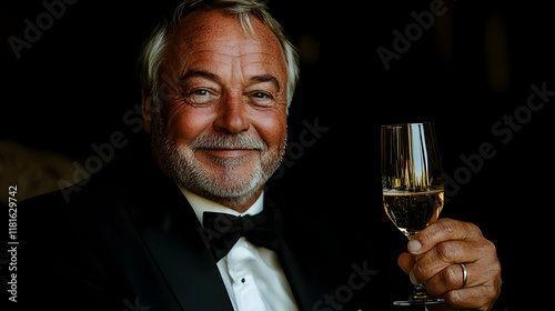 champaign, sparkling wine, celebration, toast, elegant, flute, drink, beverage, party, festive, alcohol, tuxedo, bow tie, formal, cheer, luxury, sophisticated, special occasion, evening, man, portrait, dark background, indoor, glasses, gold, bubble, smile, happy, refined, wedding, anniversary, new year's eve, holiday, success, achievement, romantic, dinner, bar, eatery, goodtime, enjoyment, pleasure, style, class, gentleman, mature, senior