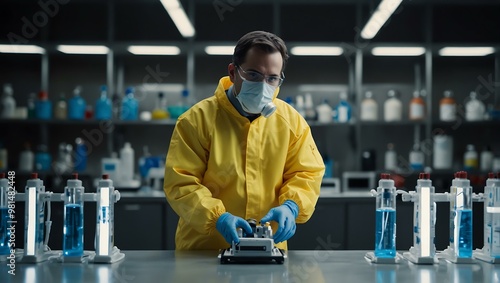 Man in a bright yellow hazmat suit with an air filter and mask, surrounded by lab equipment and LED lights