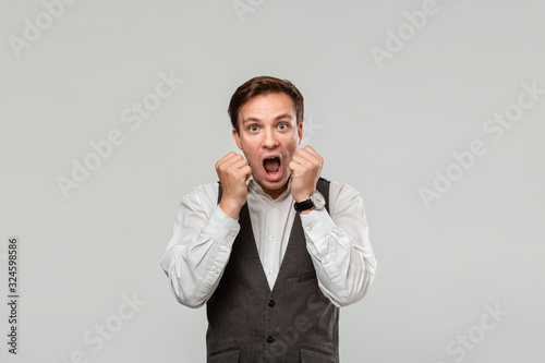 afraid, amazement, shocked, surprised, face, frightened, shock, worried, emotional, amazed, excited, confused, omg, feeling, panic, negative, screaming, panicked, unhappy, depressed, horror, problem, issue, stress, shirt, man, white, vest, businessman, lifestyle, person, studio, portrait, photogenic, caucasian, attractive, background, professional, young, grey, isolated, expression, cheerful, success, suit, modern, fit, casual attire, emotion