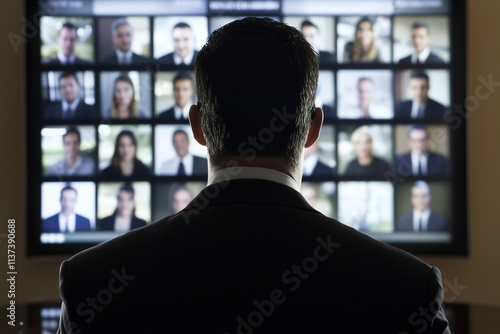 man in a suit is watching a television screen with a large number of people on it. The man is looking at the screen with a serious expression