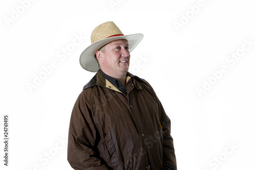 adult, casual attire, caucasian, clothing, confidence, cowboy, expression, photogenic, happy, hat, lifestyle, male, man, 1, outside, person, portrait, stubble field, white, oilskin, coat, isolated