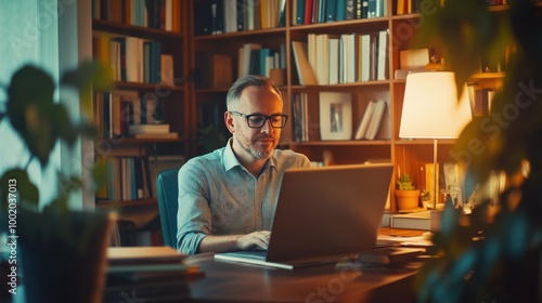 man in glasses working on his laptop in a cozy home office surrounded by bookshelves, soft lighting, and a desk lamp, creating a productive and relaxed atmosphere.