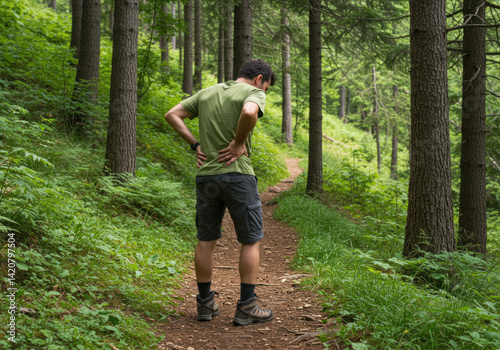 Man in green shirt and shorts on forest trail.