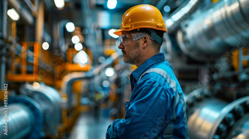 Man in hard hat and goggles, standing in a factory, surrounded by machinery, emphasizing safety and industrial work environment.