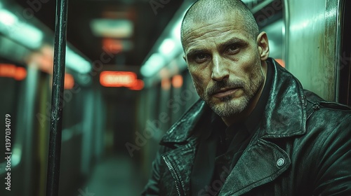 man, subway, train, portrait, leather, jacket, face, urban, travel, transport, underground, public, transit, commuter, dark, city, serious, intense, looking, adult, male, head shot, indoor, inside, tunnel, passenger, ride, expression, gaze, eye, shoulder, light, shadow, background, blurred, moody, atmosphere, depth, field, focused, person, guy, style, fashion, photogenic, attractive, bald, confidence, grit