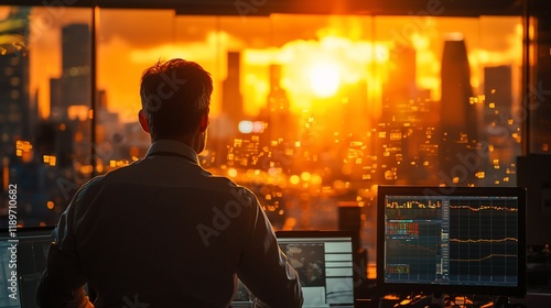 sunset, city, skyscraper, office, man, window, view, city landscape, business, building, technology, computer, screen, monitor, datum, chart, graph, sunrise, dusk, evening, light, gold, orange, modern, professional, men at work, employee, control, room, desk, back, silhouette, horizon, urban, metropolis, downtown, financial, market, trade, tower, night, day, person, adult, male