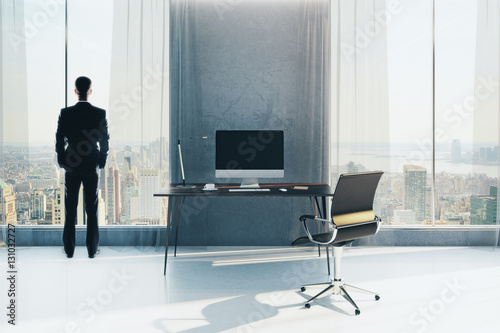 man, standing, interior, workplace, concrete, city, view, curtain, window, floor, wall, bright, sunlight, daylight, shadow, reflections, equipment, computer, monitor, copy space, blank, empty, desk, wooden, chair, hot drink, cup, table, lamp, three-dimensional, rendering, illustration, technology, new, modern, clean, loft, real, estate, architecture, back, businessman, looking, thinking, thoughtful, suit, office, men at work, business