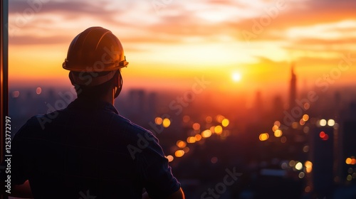 Man in safety helmet observing the framework of a developing city skyline dramatic representation of construction innovation and progress