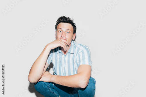 attractive, body language, clothing, copy space, copy space, cute, expression, facial expression, photogenic, indoor, jean, man, pensive, portrait, pose, posing, serious, shirt, to sit, sitting, studio, thoughtful, young
