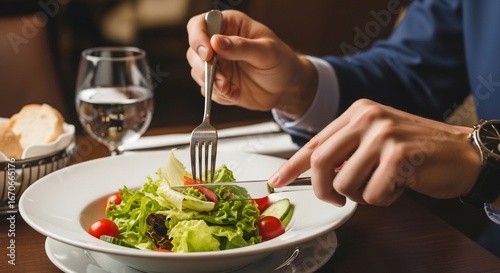 Man in suit enjoying a fresh and healthy salad in a restaurant setting