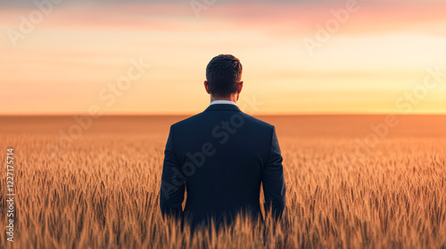 Man in suit stands in wheat field at sunset inspiring reflection nature