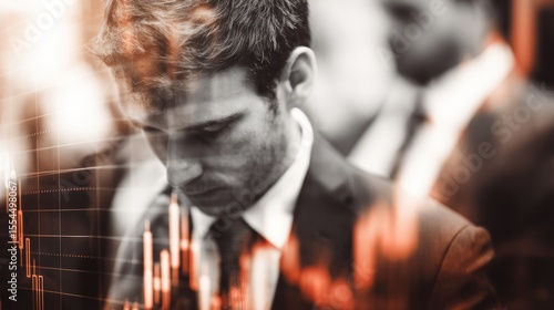Man in suit with stock market chart overlay looking down in a blurred scene.