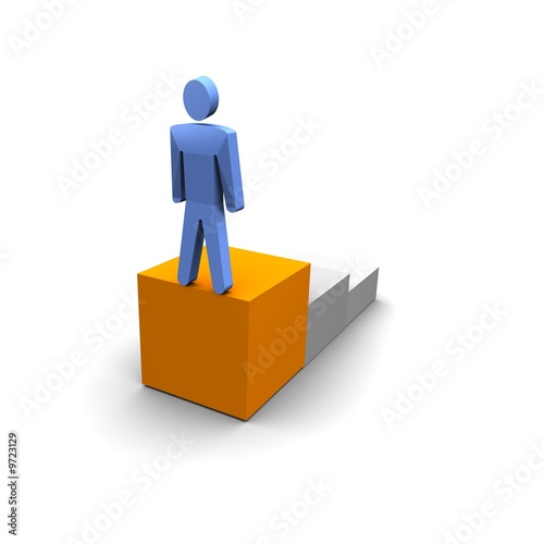 top, three-dimensional, abstract, person, business, cartoon, challenge, character, chart, concept, conceptual, graph, step, step, stair, growth, edge, human, illustration, leader, man, render, symbolic, blue, orange, graphic