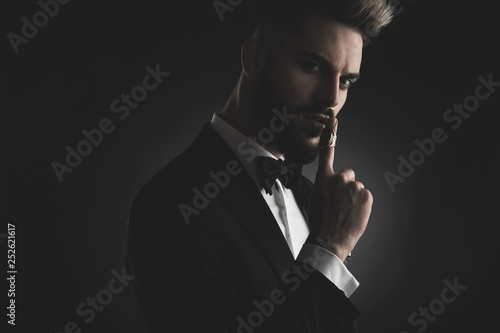 man, tuxedo, tuxedo, suit, bow tie, bow tie, bow, attaching, groom, attractive, black, background, business, businessman, young, caucasian, portrait, elegant, luxury, fashion, hair, coiffure, style, stylish, photogenic, look, male, sexy, studio, closeup, closeup, face, head, side, hold, hand, chin, lip, ring, gold, gold, finger, hush, quiet