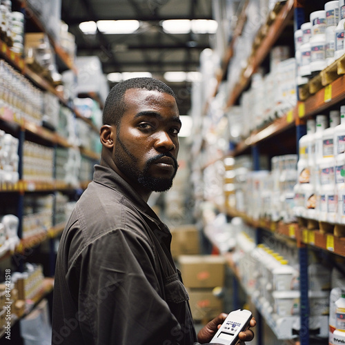 Man in warehouse with phone Amidst towering shelves in a bustling distribution warehouse, a male employee efficiently organizes inventory with a scanner, his expression of determination and focus.