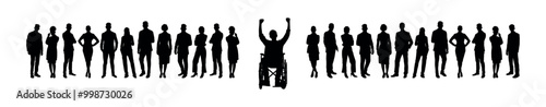 Man in wheelchair raising arms in front of group of people standing in row in black silhouettes. Disabled young man celebrating his success vector silhouette.