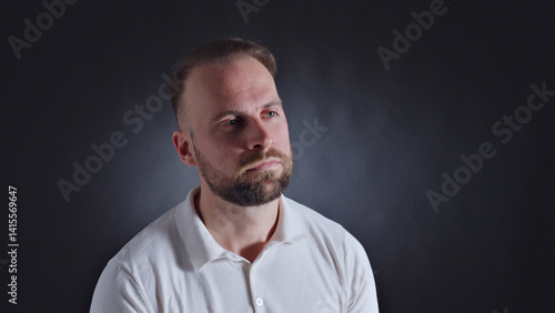 lighting, gaze, emotion, man, dark background, stillness, individuality, middle-aged, quiet, bearded, half face, calm, blue eye, closeup, thoughtful, white shirt, character, contemplative, studio shot, introspection, introspective, white-collar, neutral, personality, haircut, beard, buttons, male