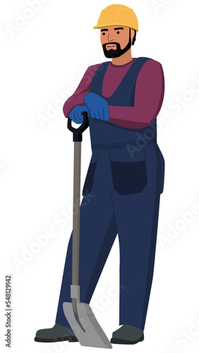 Man in work overalls and hard hat stands leaning on shovel, isolated on white. Design element.